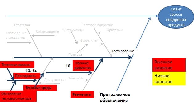 Например, говоря о тестовых средах, а именно проблемах, связанных с подбором тестовых данных, это приводит к возникновению дефектов “тестирования”, что увеличивает сроки выполнения работ по тестированию ПО. Соответственно, решив эту причину, мы автоматически сможем снизить влияние причины, связанной с дефектами. Поэтому, мы можем решать не 3 причины, а всего 2, тем самым сокращая затраты на оптимизацию процесса тестирования.