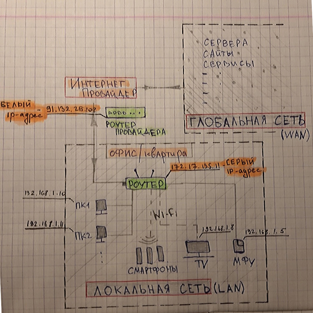 Для более наглядного представления, что такое глобальная и локальная сеть я нарисовал схематичный рисунок: