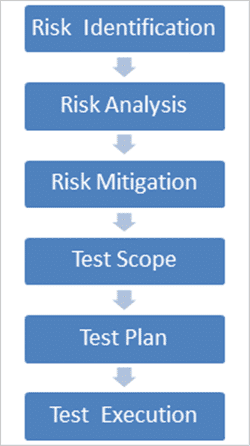 Риск идентифицируется и анализируется, т. е. рассчитывается влияние (impact) и серьезность (severity) риска, и принимаются меры в соответствии с приоритетом риска. Как только приоритет определен, начинается тестирование, т. е. создаются объем (test scope) и план тестирования, а затем выполняется тесты.